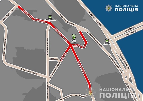 Начиная с 5 часов утра 9 мая, полицейские в Киеве перекрывают движение наземного транспорта. В частности, движение перекроют на: